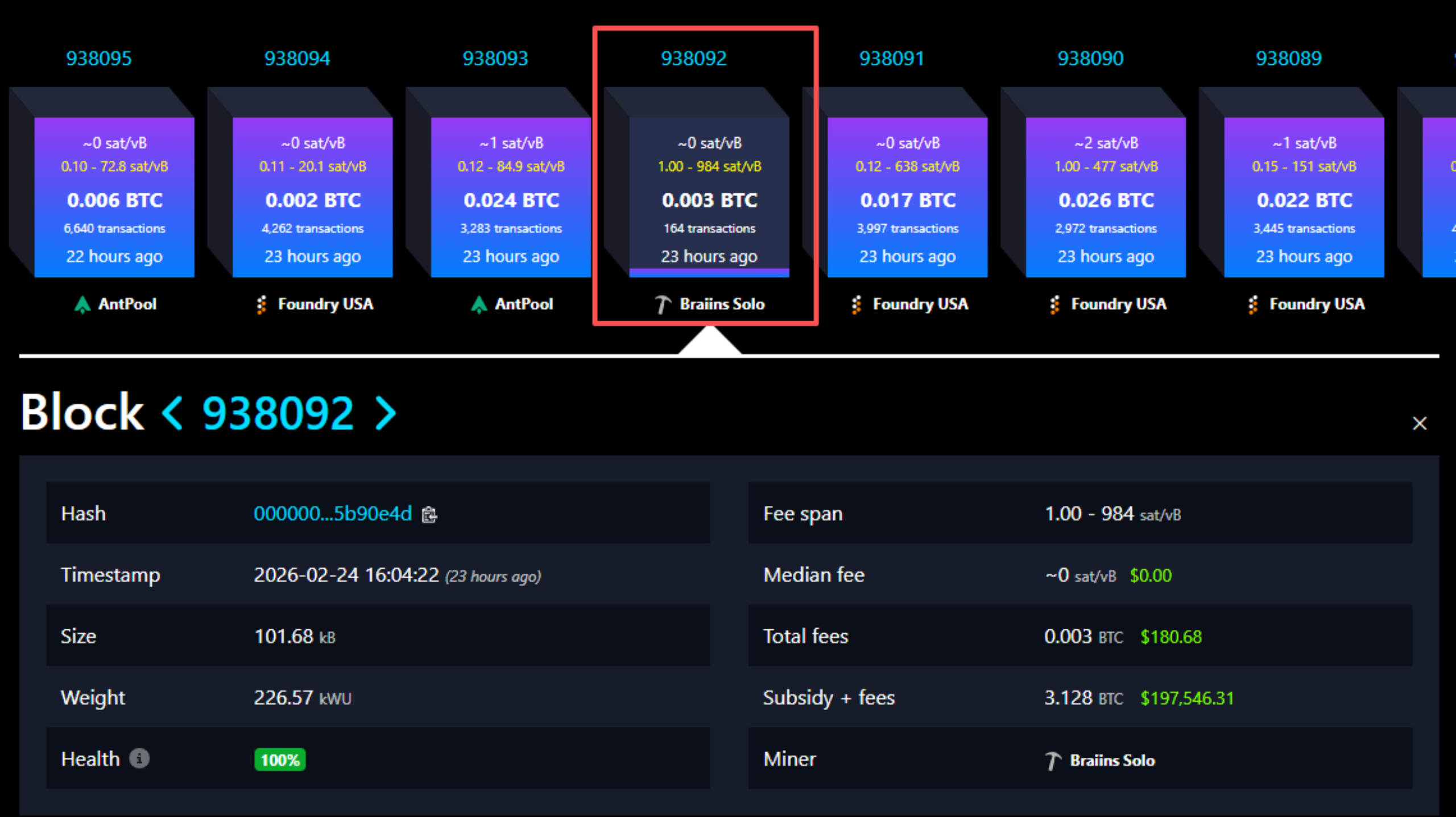 On February 24, 2026, an individual made blockchain history. Using Braiins Solo, this miner found block #938092—beating massive pools like Foundry and AntPool.The reward? A life-changing 3.128 BTC (≈$197,546).