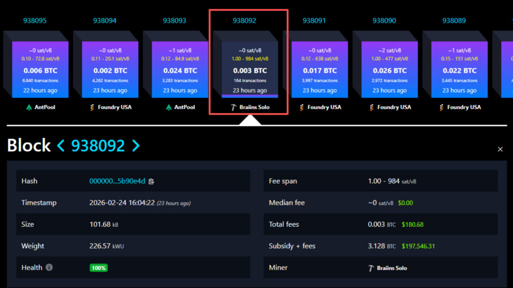 Block #938092 details: A solo miner claimed the $197K reward via Braiins Solo.